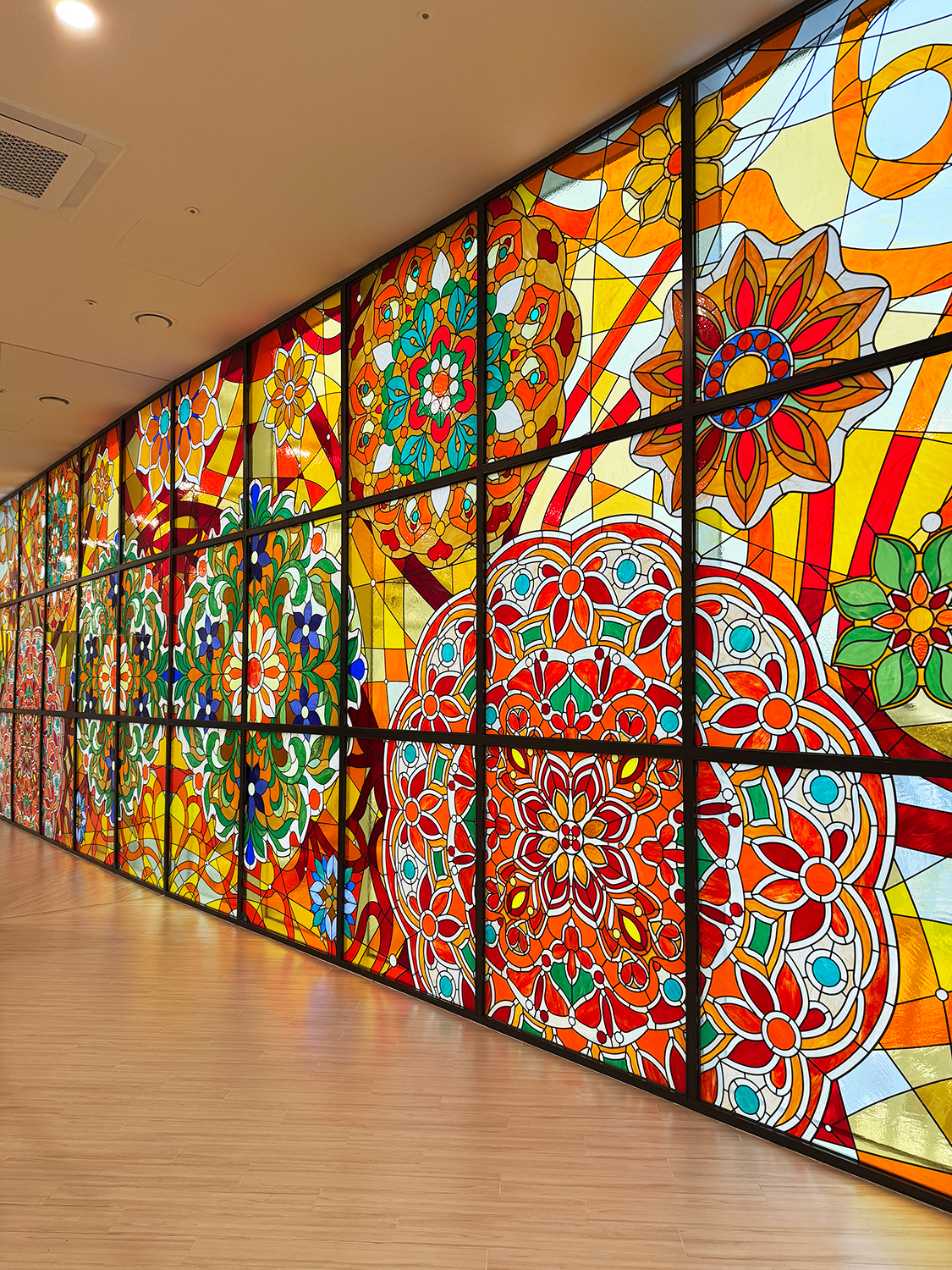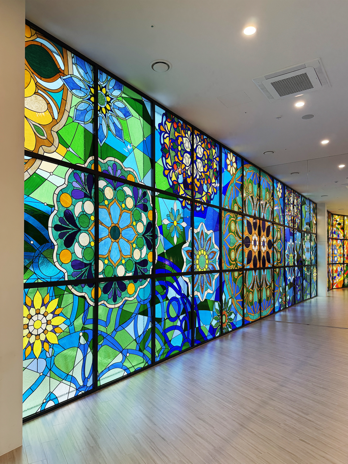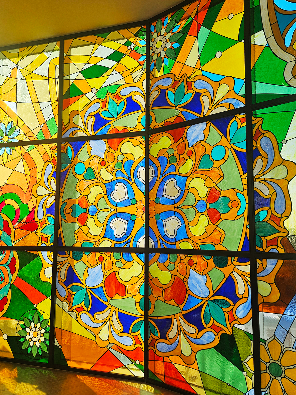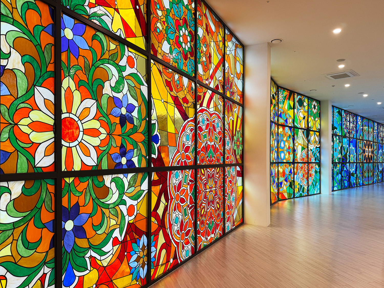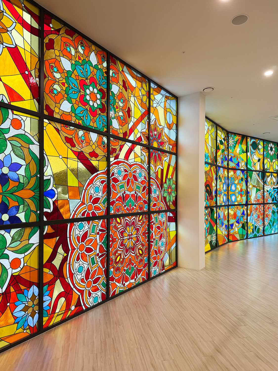공간의 초입은 블루 계열 색유리로 구성되어 있고 안쪽으로 갈수록 그린, 옐로우, 오렌지 그리고 레드와 금빛 계열의 유리가 점점 많아집니다.