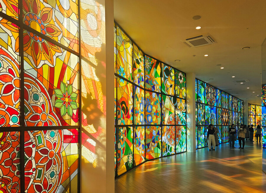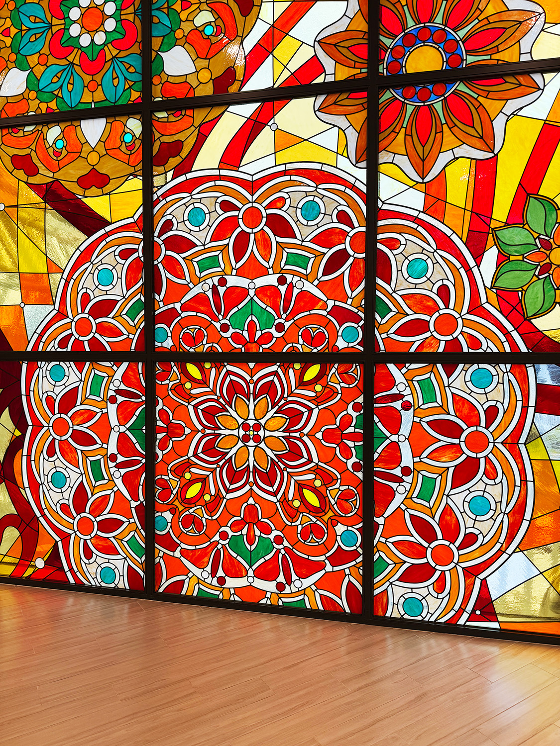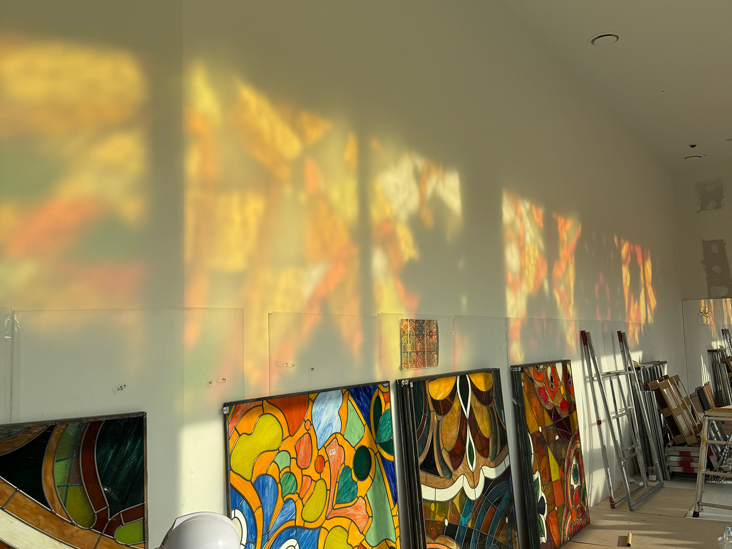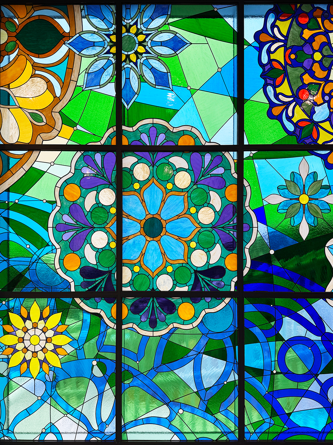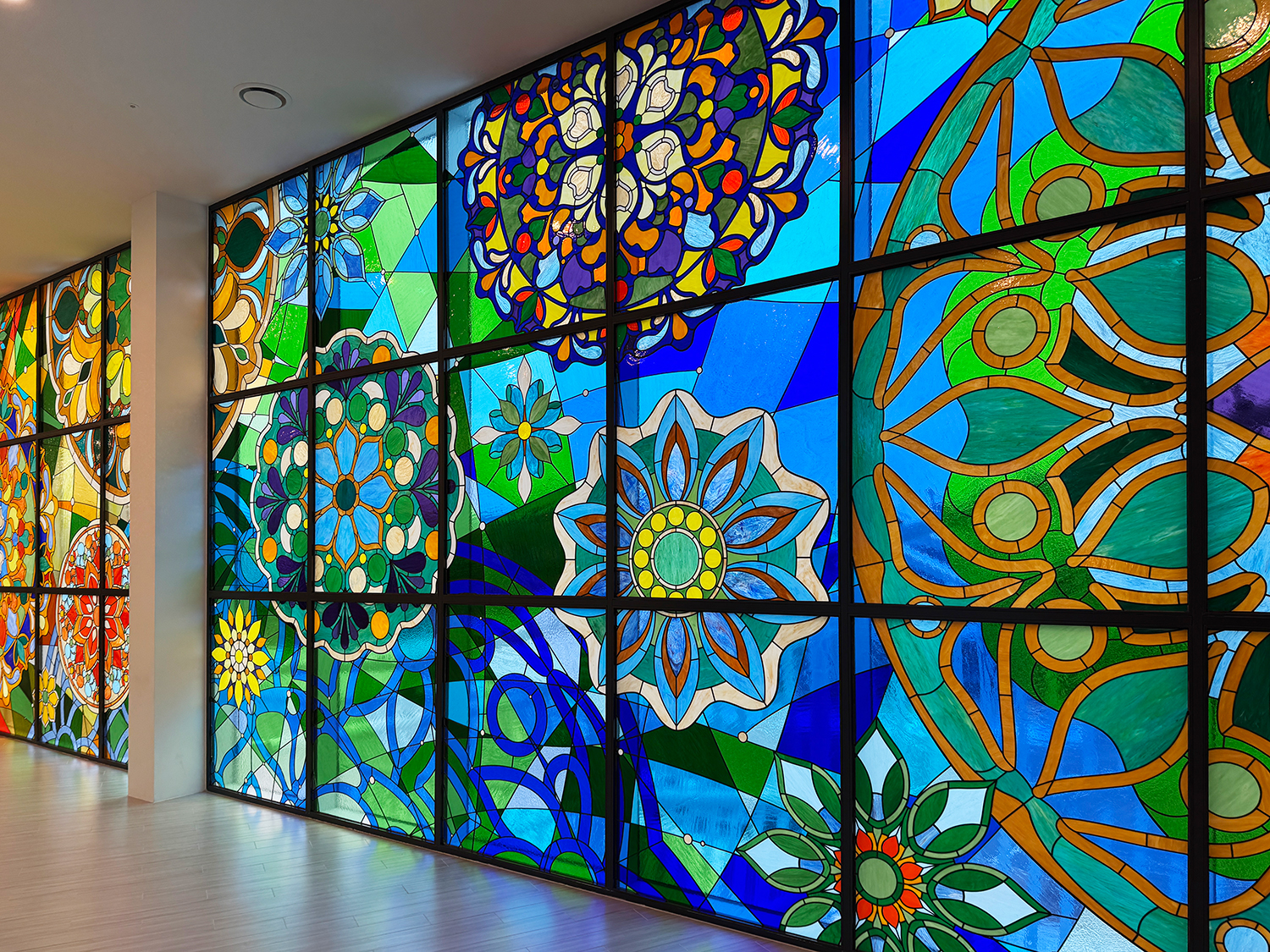 공간의 초입은 블루 계열 색유리로 구성되어 있고 안쪽으로 갈수록 그린, 옐로우, 오렌지 그리고 레드와 금빛 계열의 유리가 점점 많아집니다.