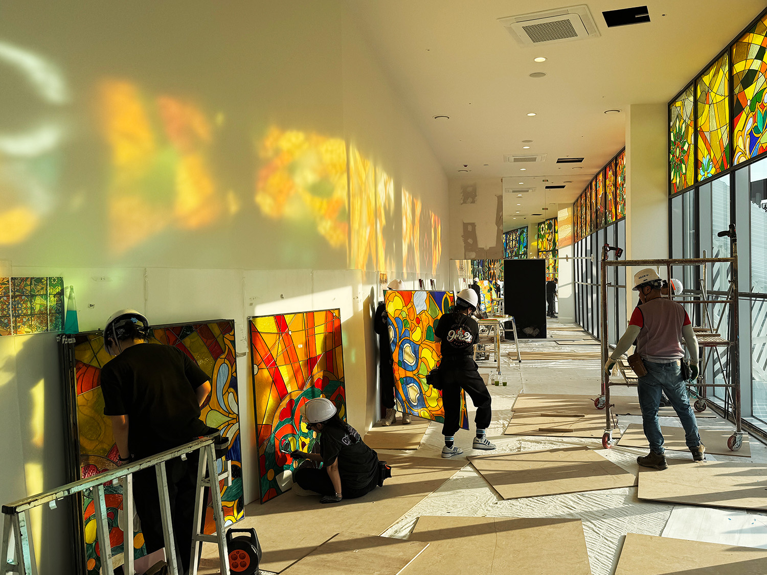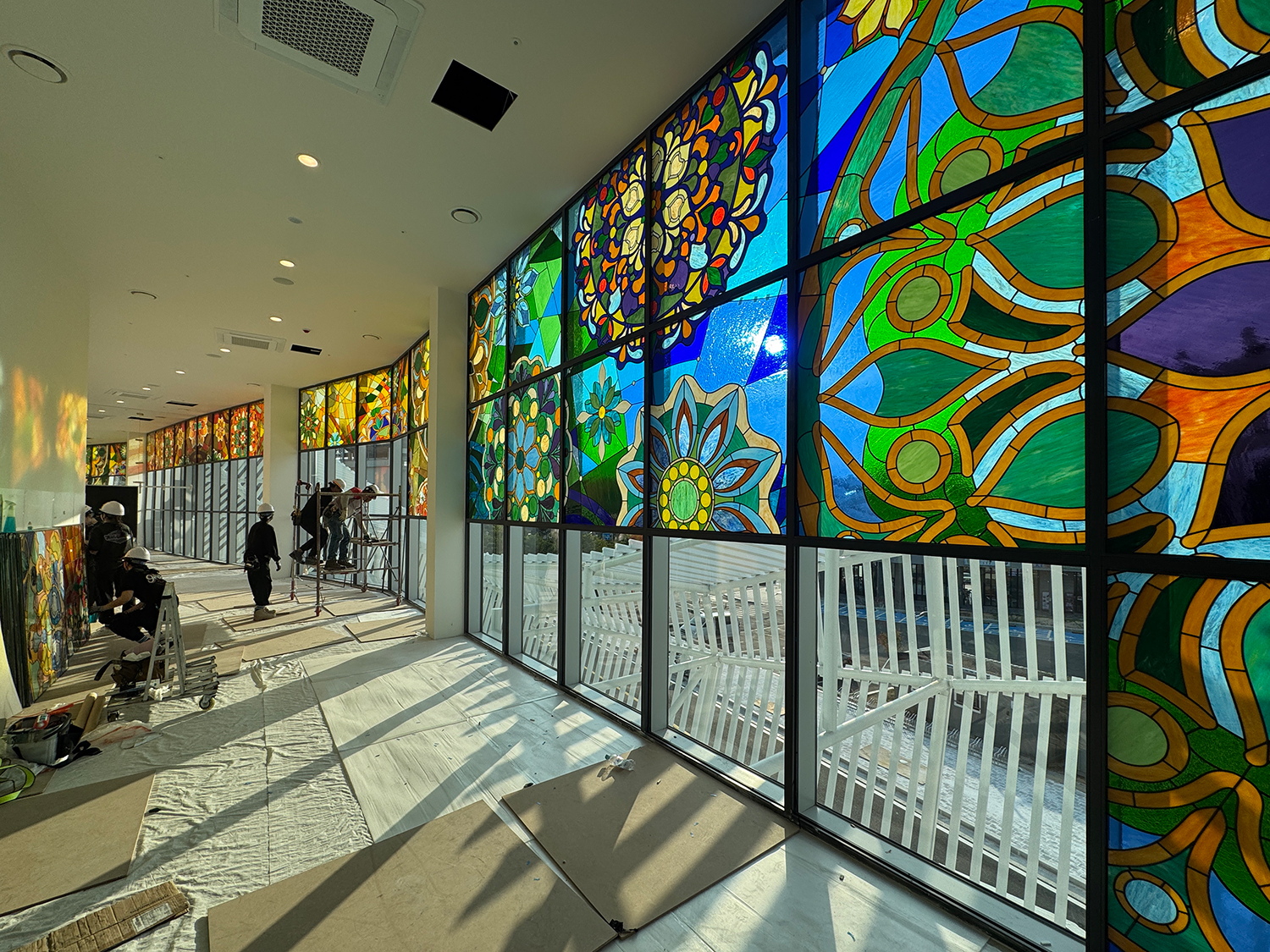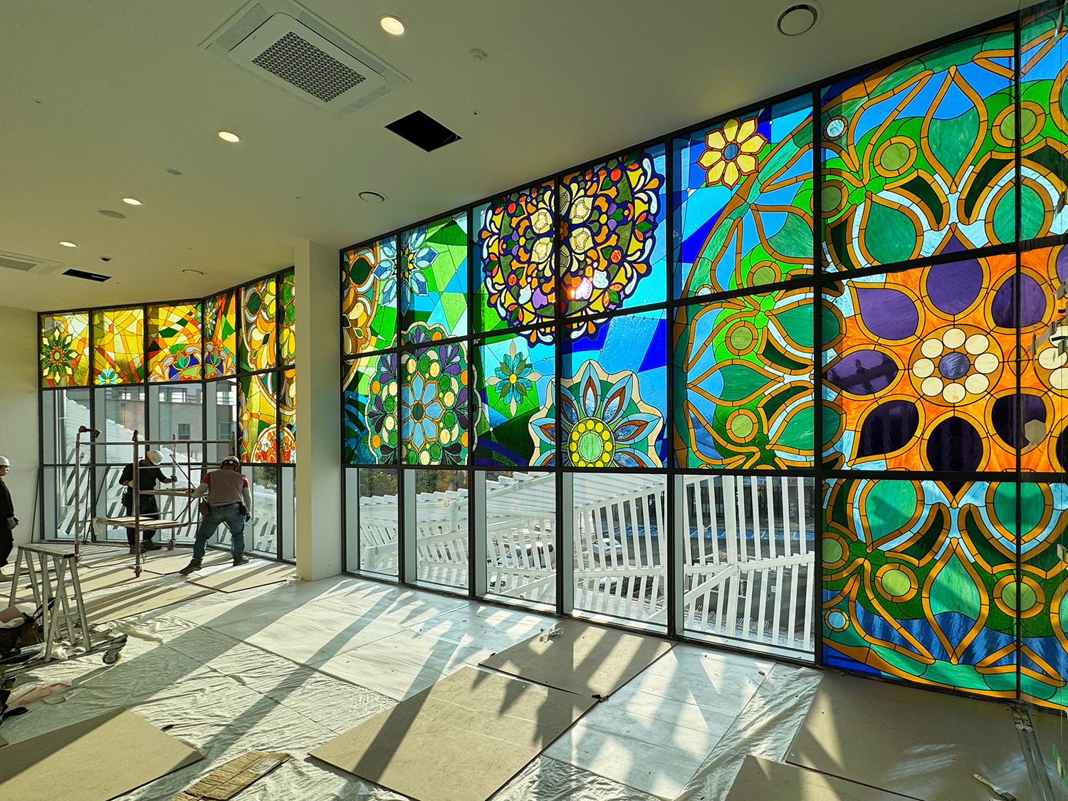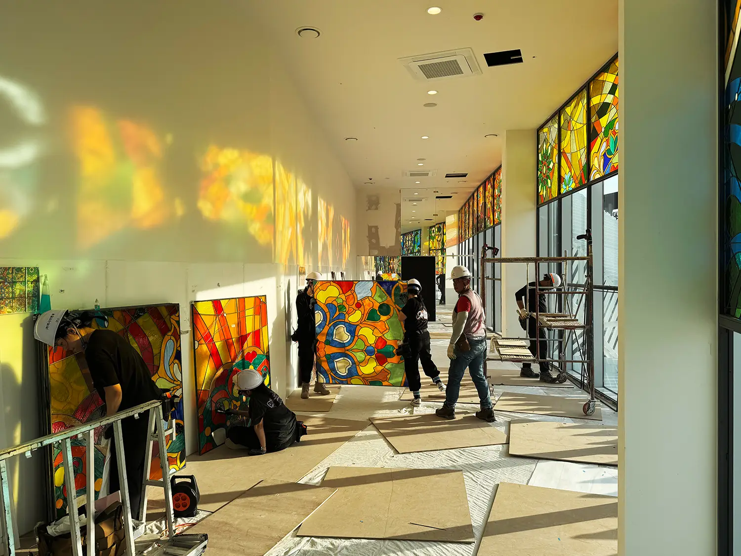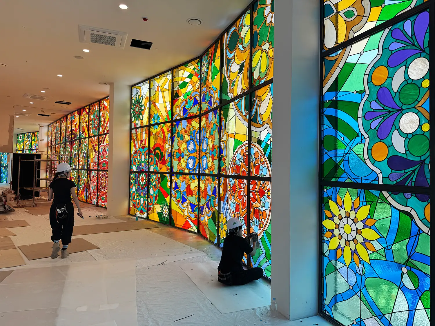 공간의 초입은 블루 계열 색유리로 구성되어 있고 안쪽으로 갈수록 그린, 옐로우, 오렌지 그리고 레드와 금빛 계열의 유리가 점점 많아집니다.