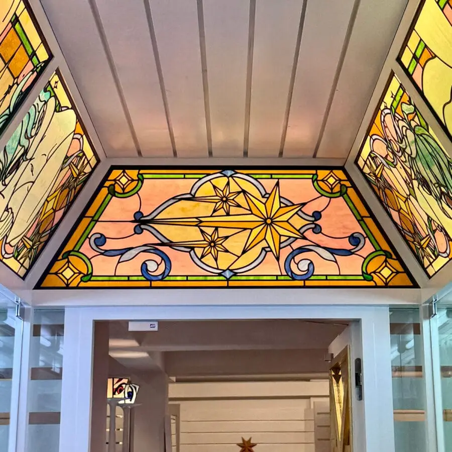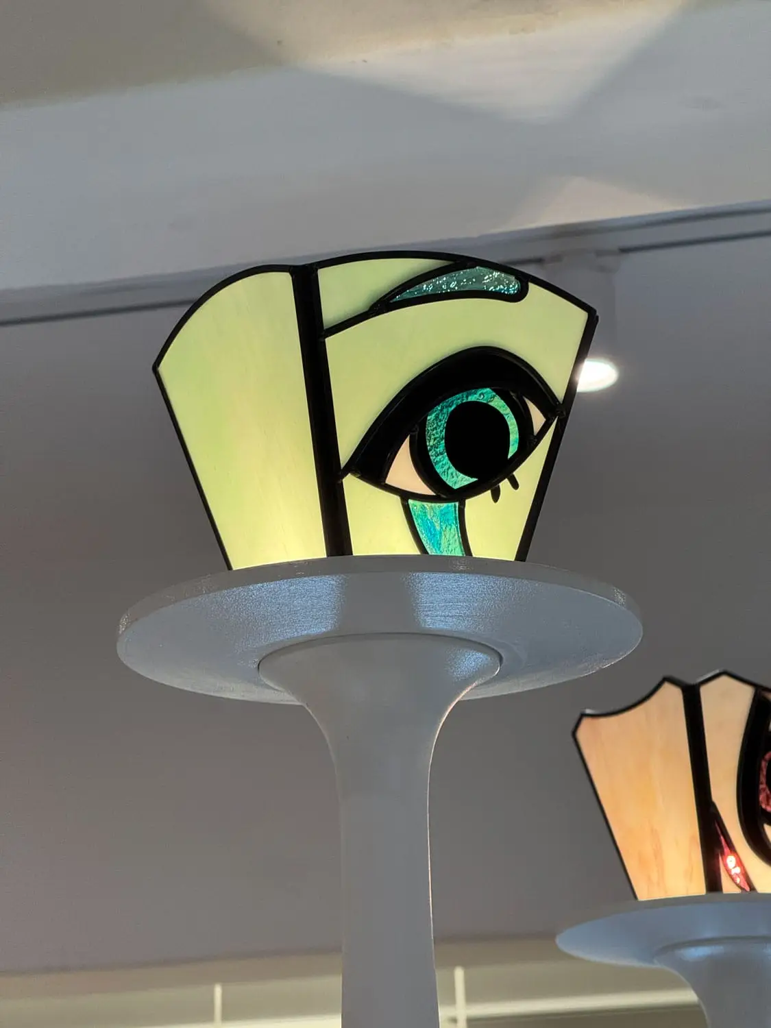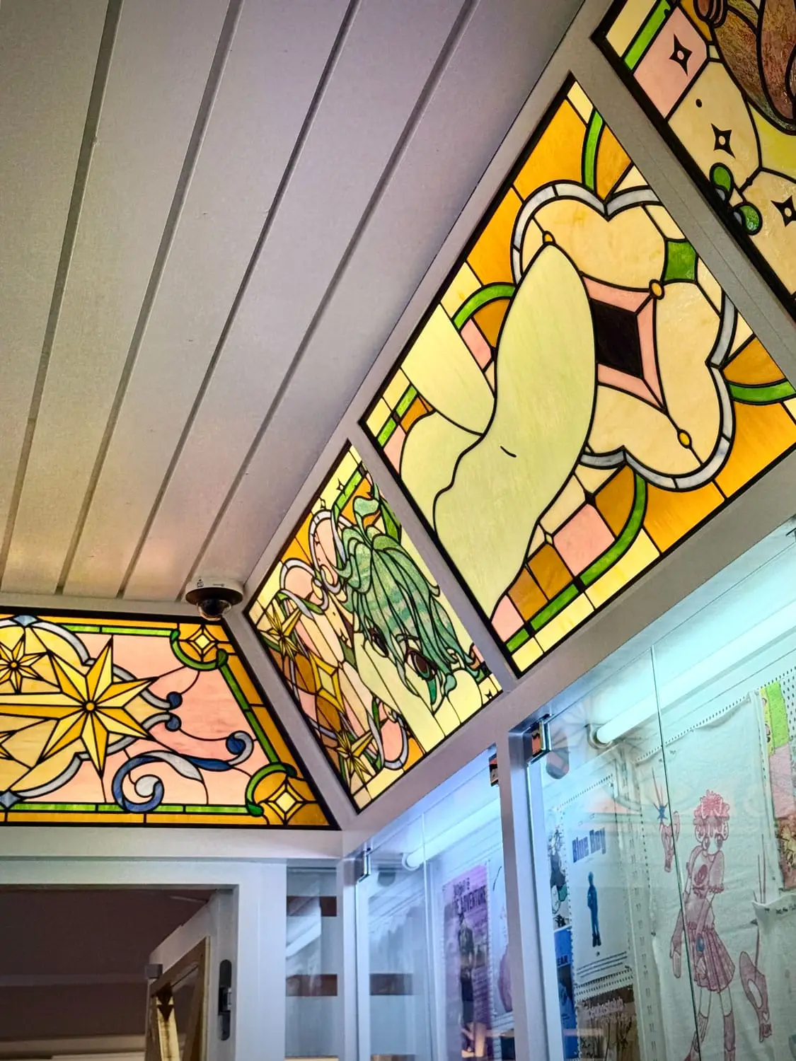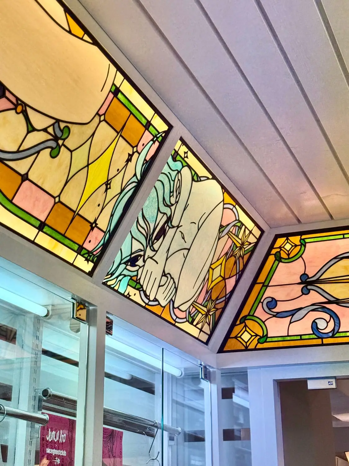 성수 ‘나이스고스트클럽’ 스테인드글라스_2 By : 박 진영 2026년 04월 27일2026년 04월 27일 • 4명의 인물들의 머리카락은 펄감이 있는 유리를 사용해 캐릭터가 더욱 도드라지도록 연출했고, 눈동자와 눈 아래 부분은 비슷하면서도 서로 다른 유리를 사용해 깊이감을 더했습니다.• 속눈썹과 배경의 별 모양 패턴은 동판을 납땜하여 입체감을 주었습니다.• 2층에 이어 1층을 또 다른 분위기로 표현할 수 있어 즐거웠습니다.✴︎ Space design: @c_o_m.kr